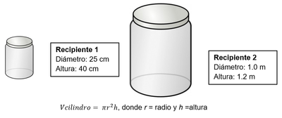 Un transportador de leche dispone de dos recipientes como los representados en la imagen. Se desea llenar de leche el recipiente 2 utilizando el recipiente 1. Para llenar el recipiente 2 se debe disponer del contenido del recipiente 1