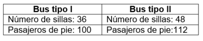 Un sistema de transporte urbano en una ciudad de Colombia utiliza dos tipos de buses. La tabla muestra la información del número de pasajeros que puede transportar cada tipo de bus. El sistema de trasporte cuenta con un total de 75 buses tipo I y 60 tipo II. La expresión que permite determinar la capacidad máxima de pasajeros que pueden transportar la totalidad de buses es: