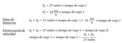 El capitán de una embarcación debe dirigir su barco desde el puerto O hasta el puerto Q, pasando por el puerto P. En el trayecto de O a P mantuvo una velocidad constante de 27 nudos; sin embargo, al momento de zarpar del puerto P con rumbo al puerto Q, su velocímetro se averió y tuvo que usar un repuesto extranjero que marcó durante todo el trayecto una velocidad de 50 km/h. Al llegar a Q, el capitán tenía que reportar la hora de salida de O, con tan mala fortuna de haber olvidado mirar la hora al momento de zarpar.