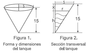 En una industria construyen un tanque de forma cónica de radio 5 dm y altura 15 dm, para el almacenamiento de agua, pero por una falla en su construcción pierde agua a razón de 1 dm cúbico por minuto. Al cabo de t minutos, h(t) representa: