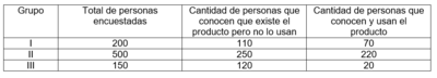 Una empresa ha hecho un estudio para determinar qué tan conocido es el producto que ofrece. Para este estudio realizaron encuestas dividiendo la población encuestada en tres grupos. Los resultados fueron los que se muestran en la tabla. Una persona que lee esta información, asegura que en el grupo III se conoce más el producto, que en el grupo I. ¿Estaría usted de acuerdo con esto?