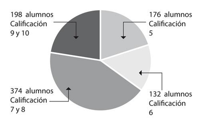 Observa la siguiente gráfica sobre el desempeño de los 880 alumnos de una escuela en la asignatura de Matemáticas en un bimestre y contesta la pregunta. ¿Qué porcentaje de alumnos obtuvo calificaciones de 9 y 10 en el bimestre?