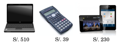 La mamá de Jorge quiere comprar 2 tablets, 1 calculadora y 2 laptops en el Centro Comercial Minka. ¿Cuánto tendría que pagar en total?