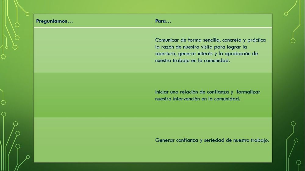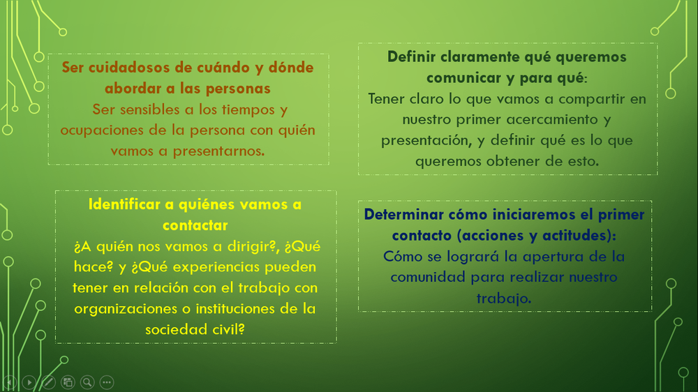 Es importante [blank_start]identificar[blank_end] claramente quiénes son nuestro público para [blank_start]definir[blank_end] nuestra estrategia de acercamiento y presentación, con base en sus [blank_start]características[blank_end]. Esta estrategia contempla la preparación de materiales y presentaciones en un lenguaje [blank_start]sencillo[blank_end] y concreto, así como decidir si es conveniente [blank_start]usar[blank_end] proyectores o bien [blank_start]usar[blank_end] hojas rotafolio y folletos de la organización.
