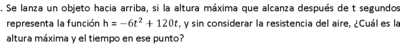 Se lanza un objeto hacia arriba, si la altura máxima que alcanza después de t segundos representa la función h = , y sin considerar la resistencia del aire, ¿Cuál es la altura máxima y el tiempo en ese punto?