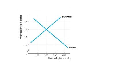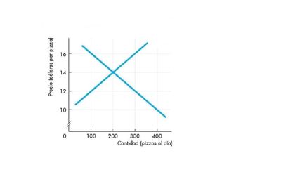 En relación a esta figura, si el precio de las pizzas es de 10 dolares, la cantidad de pizzas demandada es cero y la cantidad de pizzas ofertada es 400 por lo que se genera un deficit o faltante de productos en el mercado de pizzas por lo que el precio tiende a disminuir aún más.