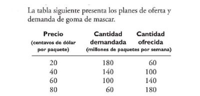 La tabla presenta los planes de oferta y demanda de goma de mascar.