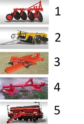 Arado 5, rastra 3, sembradora 4, nivelador 2, cultivador/surcador 1