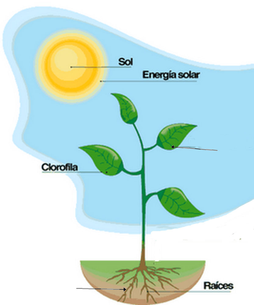 Las plantas para poder elaborar sus nutrientes requieren de los siguientes insumos; en la siguiente imagen completa los nombres de estos considerando la estructura de la planta que permite su obtención.