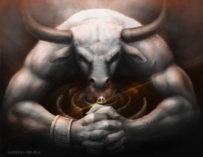 El minotauro era hijo de Pasifae, esposa del rey Minos de Creta y de un toro blanco enviado por Poseidón, dios del mar. Minos había ofendido gravemente a Poseidón quien como venganza hizo que Pasifae se enamorase del animal. Fruto de dicha unión nació el Minotauro, un ser violento, mitad hombre, mitad toro, que se alimentaba de carne humana. Para esconder su vergüenza y proteger a su pueblo, el rey Minos rogó al inventor Dédalo que le construyera un laberinto del que el monstruo nunca pudiera salir. Cada nueve años, a fin de apaciguarlo, Minos le ofrecía la bestia, siete mujeres y siete jóvenes que imponía como tributo a la ciudad de Atenas. En una ocasión, Teseo se ofreció voluntario como víctima, con la intención de matar al Minotauro y liberar a Atenas de un cruel destino. Con la ayuda de Ariadna, la hija del rey, que se había enamorado de él, logro su propósito: Ariadna le ofrece a Teseo un ovillo de hilo que le ha dado Dédalo, el arquitecto del laberinto. Habiendo atado uno de sus extremos en la entrada y siguiendo el hilo por los intrincados vericuetos del laberinto, Teseo puede, efectivamente, encontrar la salida.