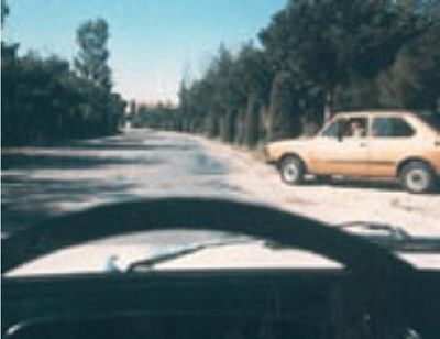 Usted ha comenzado a adelantar. El auto de la derecha va a aproximadamente 80 km/h. Por su espejo retrovisor usted ve otro auto que tiene intención de adelantar. ¿Qué hace usted?
