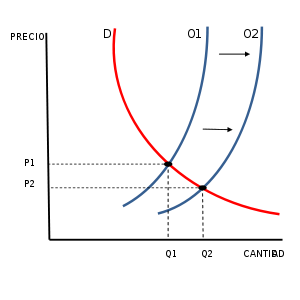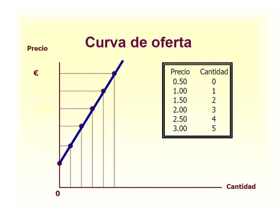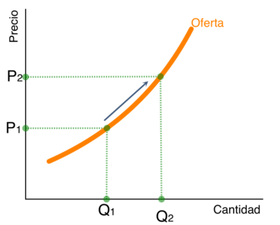 Según se muestra en la gráfica, la curva de oferta muestra pendiente [blank_start](blanco)[blank_end] por su relación entre [blank_start](blanco1)[blank_end] y [blank_start](blanco2)[blank_end]