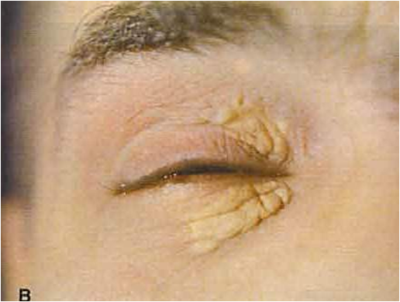 Paciente varón de 45 años, con IMC de 31 y sin otros antecedentes mórbidos, consulta por aparición progresiva de una lesión en párpado derecho, que al examen es levemente solevantada, de forma irregular y coloración amarillenta