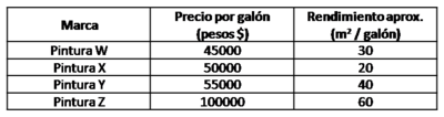 Un albañil encuentra diferentes opciones para la compra de pintura, como se muestra en la tabla.