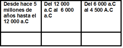 Observa la línea del tiempo que se te presenta y ubica los periodos correspondientes a la edad de piedra de acuerdo a su periodo de duración.