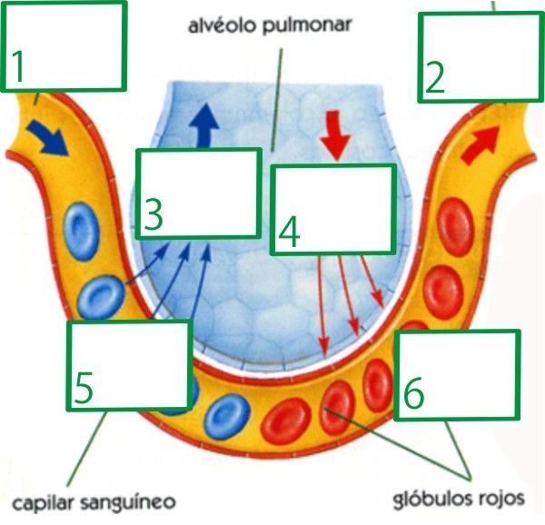 La sangre que llega a los alvéolos viene cargada de [blank_start]CO2[blank_end]. Cuando la sangre está en [blank_start]el capilar[blank_end] junto al alvéolo entrega el [blank_start]CO2[blank_end] y recoge el [blank_start]O2[blank_end]. Este gas procede de la inspiración. El intercambio de gases se produce por [blank_start]difusión[blank_end], desde el lugar donde hay [blank_start]más presión[blank_end] de gas al lugar que hay [blank_start]menos presión[blank_end]. Por eso es importante que la sangre en los pulmones circule.