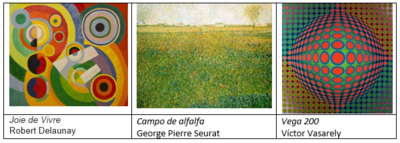 ¿Cuál de las opciones es el argumento apropiado para apreciar la similitud entre las pinturas de Seurat, Delaunay y Vasarely que se muestran en la imagen?