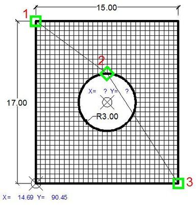 Anclados en la coordenada indicada, cree el dibujo de la imagen, cree un circulo desde el centro del rectángulo. Encuentre las coordenadas para el centro del circulo, y tome la longitud total de los puntos 1,2 y 3.
