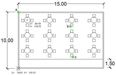 Dibuje el espacio de 15x10 (Enganchándose de las coordenadas); espesor de pared 15 cms, Radio de mesas 0.50, aplique “Matriz” en su forma polar para obtener las 4 sillas (45cms x 45cms) de las mezas (La separación entre sillas y mesa será 10cms), y deberá usar “Matriz” en su forma rectangular la separación entre filas será de -5.40 y de columnas 11.70. Encuentre las coordenadas para los puntos a,b y c.