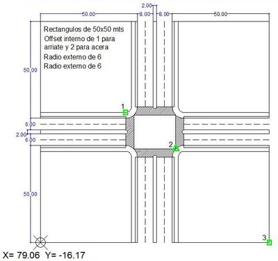 Dibuje la siguiente intersección de calle (Ver imagen), la esquina inferior izquierda del dibujo deberá estar anclada en la coordenada indicada, al finalizar el dibujo, encuentre las coordenadas 1,2 y 3.
