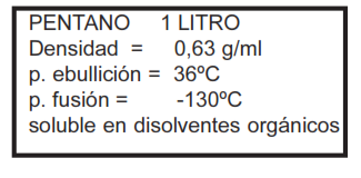 En el laboratorio de química, un recipiente tiene la etiqueta que se muestra en la figura, la cual identifica un compuesto orgánico (alcano). Si en un paso del procedimiento para la experiencia, se le solicita preparar una solución de esa sustancia al 0.8 M. ¿Cuál de los datos suministrados en la etiqueta serían de ayuda para preparar la solución?