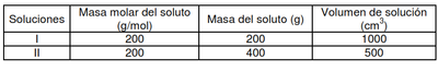 La figura muestra los datos para las soluciones I y II de una sustancia desconocida. Teniendo presente la información de la tabla y recordando que la concentración se puede expresar en unidades de molaridad, cuya fórmula química es: