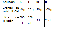 La siguiente tabla muestra los datos para la preparación de cuatro soluciones: K, L, M, N de hidróxido de sodio (NaOH); si las masas atómicas son: Na= 23 g, O= 16 g, H= 1 g; se puede establecer que las soluciones que presentan igual concentración molar son: