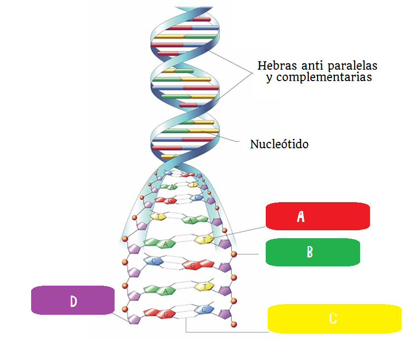 En la estructura de doble cadena, las bases que se enfrentan son siempre una purina, en una cadena, con una pirimidina en la cadena opuesta; esto hace que podamos encontrar cuatro tipos de pares de nucleótidos: A-[blank_start]T[blank_end] , T-[blank_start]A[blank_end], G-[blank_start]C[blank_end] y C-[blank_start]G[blank_end].