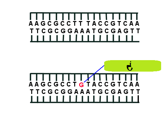 Si nuestra secuencia de ADN se visualiza en la imagen de arriba. Lo que sucede con la secuencia de abajo es que ocurrió una mutación en esa secuencia.