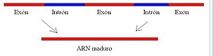 El [blank_start]exón[blank_end] es la región de un gen que no es separada durante el proceso de corte y empalme y, por tanto, se mantienen en el ARN mensajero maduro. En los genes que codifican una proteína, son los exones los que contienen la información para producir la proteína codificada en el gen. En estos casos, cada exón codifica una porción específica de la proteína completa, de manera que el conjunto de exones forma la [blank_start]región codificante[blank_end] del gen. En [blank_start]eucariotas[blank_end] los exones de un gen están separados por regiones largas de ADN (llamadas [blank_start]intrones[blank_end]) que no codifican.