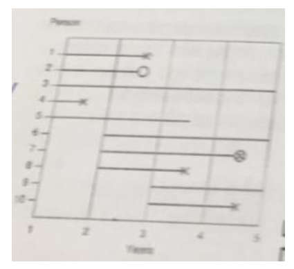 En la imagen se representa la aparición del cáncer de mama en un estudio de seguimiento de 4 años (“years”) de duración en el que se observaron 10 mujeres (“person”). Todos los eventos relevantes, esto es, la detección del cáncer de mama (“x”), la muerte por cualquier causa (“O”) y la muerte por cáncer de mama (“ ”), suceden en los puntos medios de cada intervalo de tiempo. El total de personas-tiempo en riesgo de esta cohorte es: