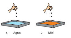 En dos bandejas 1 y 2 idénticas se sueltan dos piedritas a intervalos iguales de tiempo. La bandeja 1 está llena con agua y la bandeja 2 con miel. Simultáneamente se toman fotografías de cada bandeja. Tenga en cuenta que la velocidad de propagación es proporcional a la densidad de las sustancias. Comparando las características de las ondas generadas en el agua y en la miel se puede afirmar que las que se generan en agua se propagan con: