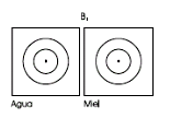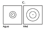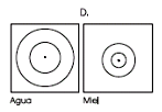 En dos bandejas 1 y 2 idénticas se sueltan dos piedritas a intervalos iguales de tiempo. La bandeja 1 está llena con agua y la bandeja 2 con miel. Simultáneamente se toman fotografías de cada bandeja. Tenga en cuenta que la velocidad de propagación es proporcional a la densidad de las sustancias. La figura que mejor ilustra las formas de las ondas generadas en las superficies de los fluidos, es