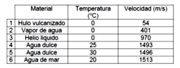La siguiente tabla muestra la velocidad de propagación del sonido en diferentes materiales, que se encuentran a diferentes temperaturas.