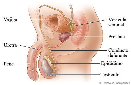 pene, uretra, escroto, testiculos, conductos deferentes, vesículas seminales y prostata