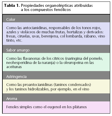 Los compuestos fenólicos intervienen en las características organolépticas de las frutas y verduras, al intervenir en gran medida en el color natural y en el sabor que estas poseen.