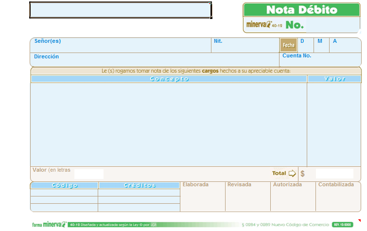 Un comprobante que utiliza la empresa para cargar en la cuenta de sus clientes,un mayor valor por concepto de omisión o error en la liquidación de facturas y los intereses causados por financiación o por mora en el pago de sus obligaciones.