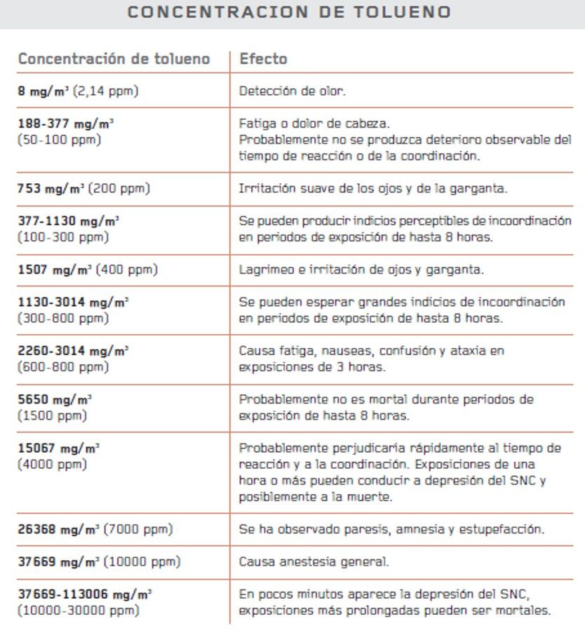 Riesgos ocupacionales (exposición /daño), los límites de exposición ocupacional al tolueno por razones de salud deben situarse entre los 200 y 375 mg/m3