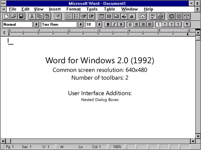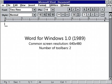 Word 2000 (1999)Creado en el año de 1999 y lanzado al mercado en el 2000 con las siguientes características: Resolución de Pantalla de 1024x768, Número de Herramientas 23, Menús Personalizados con expansión a corto tiempo, Barra de herramientas por defecto en una sola fila, Botones de las barras de herramientas mostrar ocultar basado en la frecuencia deuso,Una ventana de la barra de herramientas para el documento, Libertar para escoger el ayudante de office.