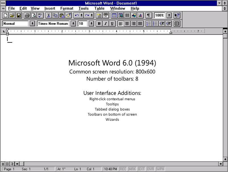 1994El office 4.0 salio al mercado en 1994, word paso a llamarse word 6.0 en este punto a pesar deque la version anterior habia sido la 2.0 el proposito de esto era unificar la numeracion de versiones con la version para MAC OS.