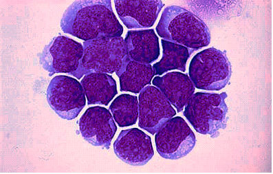 o Núcleo fuertemente basófilo de forma irregular, citoplasma devilmente basófilo .