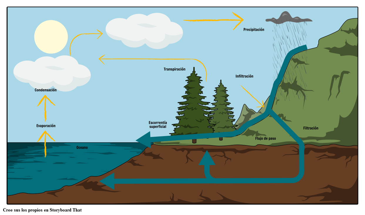 El ciclo del agua es el proceso de circulación del agua entre los distintos compartimientos que forman la hidrosfera. Comienza con la evaporación del agua desde la superficie del océano, condensándose y formando una nube para luego precipitarse.