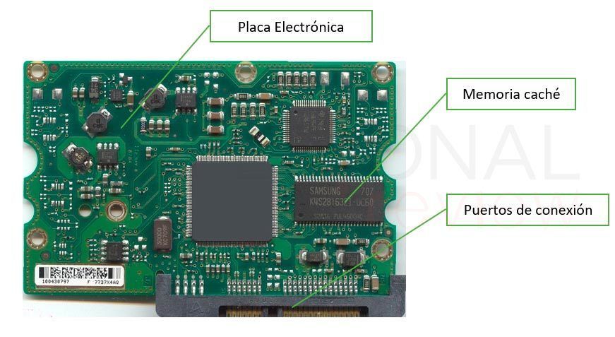 Memoria caché: los discos duros actuales cuentan con un chip de memoria integrada en el circuito electrónico que hace las veces de puente de intercambio de información desde los platos físicos hasta la memoria RAM. Es como un búfer dinámico para aligerar el acceso a la información física.