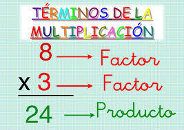 Los términos de la multiplicación son los factores y el producto.FACTORES: son los números que se multiplicanPRODUCTO: es el resultado de la multiplicación.