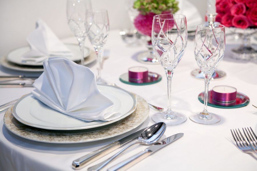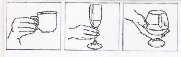La primera precaución que debe tomarse al asir una taza o copa es la de no dejar el meñique "volando"; debe curvarse suavemente, igual que los demás dedos. Las copas de vino y champaña se sostienen por el "tallo", con las puntas de los dedos. De esta manera, el calor de la mano no altera la temperatura de estas bebidas. En cambio, las copas que contienen coñac o brandy se sostienen por la base, rodeando la copa, para que el calor de la mano ayude a expandir su aroma (bouquet).