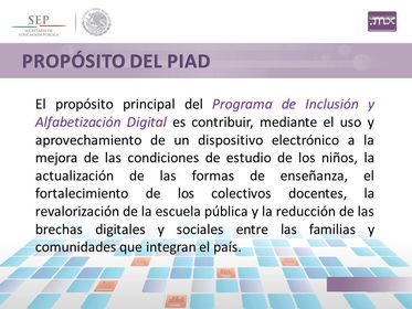 La Subsecretaría de Educación Básica a través de la Dirección General de Materiales e Informática Educativa es el área encargada de dar seguimiento al Programa de Inclusión y Alfabetización Digital, y es a través de las autoridades educativas de los cinco estados participantes y el Distrito Federal que se gestiona la entrega de tabletas a todos los alumnos de quinto grado de escuelas públicas de educación primaria.