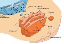 Transporte y secreción de proteínas y lípidos desde la cara cis a la trans, al tiempo que tienen lugar los procesos de modificación necesarios. En la cara trans se forman las vesículas de secreción y algunas están recubiertas. Las proteínas y los lípidos se transportan uniéndose a oligoelementos. Las vesículas secretoras se fusionan con la memb. plasmática y se produce un aumento de superficie celular que se compensa con la formación de vesículas de endocitosis.