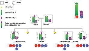Después de la trisomía libre, la causa más frecuente de aparición del exceso de material genético es la traslocacion. En esta variante el cromosoma 21 extra (o un fragmento del mismo) se encuentra “pegado” a otro cromosoma (frecuentemente a uno de los dos cromosomas del par 14),