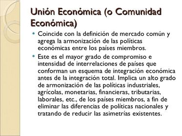 47. Unión Económica: Es el acuerdo entre países que adoptan una moneda en común y políticas macro-económicas, sectoriales y sociales.