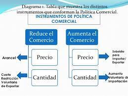 En si la política comercial busca controlar la exportación e importación de productos específicos de un país por medio de barreras arancelarias donde se cobran diferentes impuestos para dificultar un poco la entra de productos al país y también de barreras no arancelarias que busca controlar con normas legales como las de sanidad entre otras .